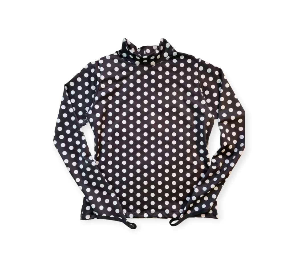 Camiseta corte dama, cuello polera, mangas mitones confeccionada en Lycra.
