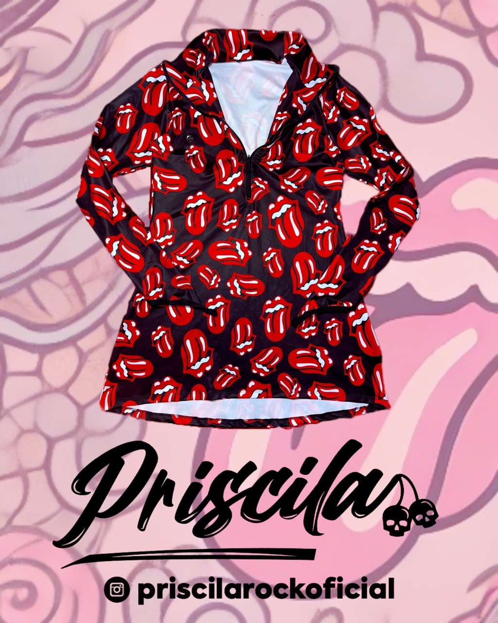 Vestido con cierre delantero y vistas internas. Mangas largas tipo mitón y cuello media polera, confeccionado en Lycra.